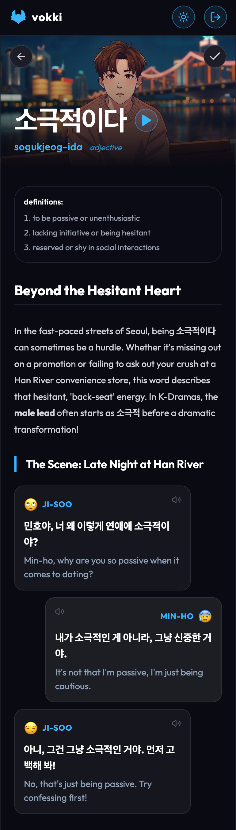 binge korean lessons at 3am like you binge dramas. dark mode that won't kill your eyes or your vibe.